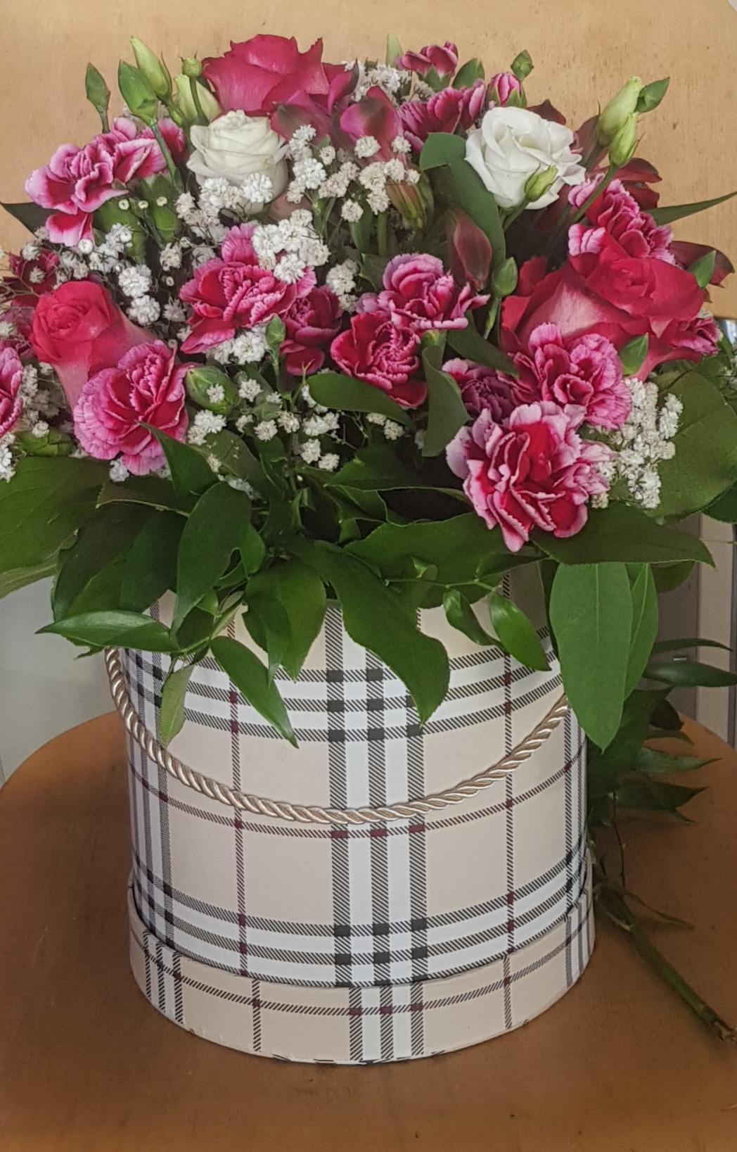 Kompozycja w pudełku na gąbce florystycznej róża, goździk, eustoma, zieleń, gipsówka
