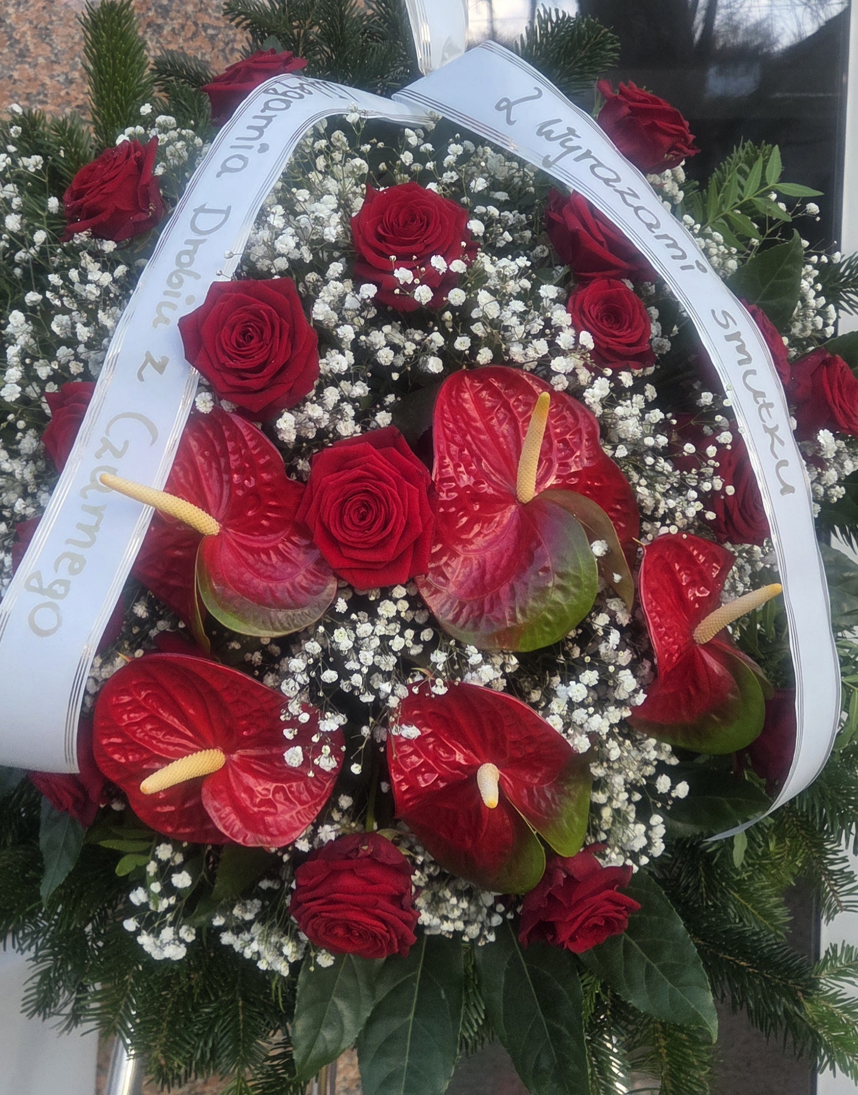 Wieniec z czerwonych róż i anturium wypełniony gipsówką oraz piękną zielenią.