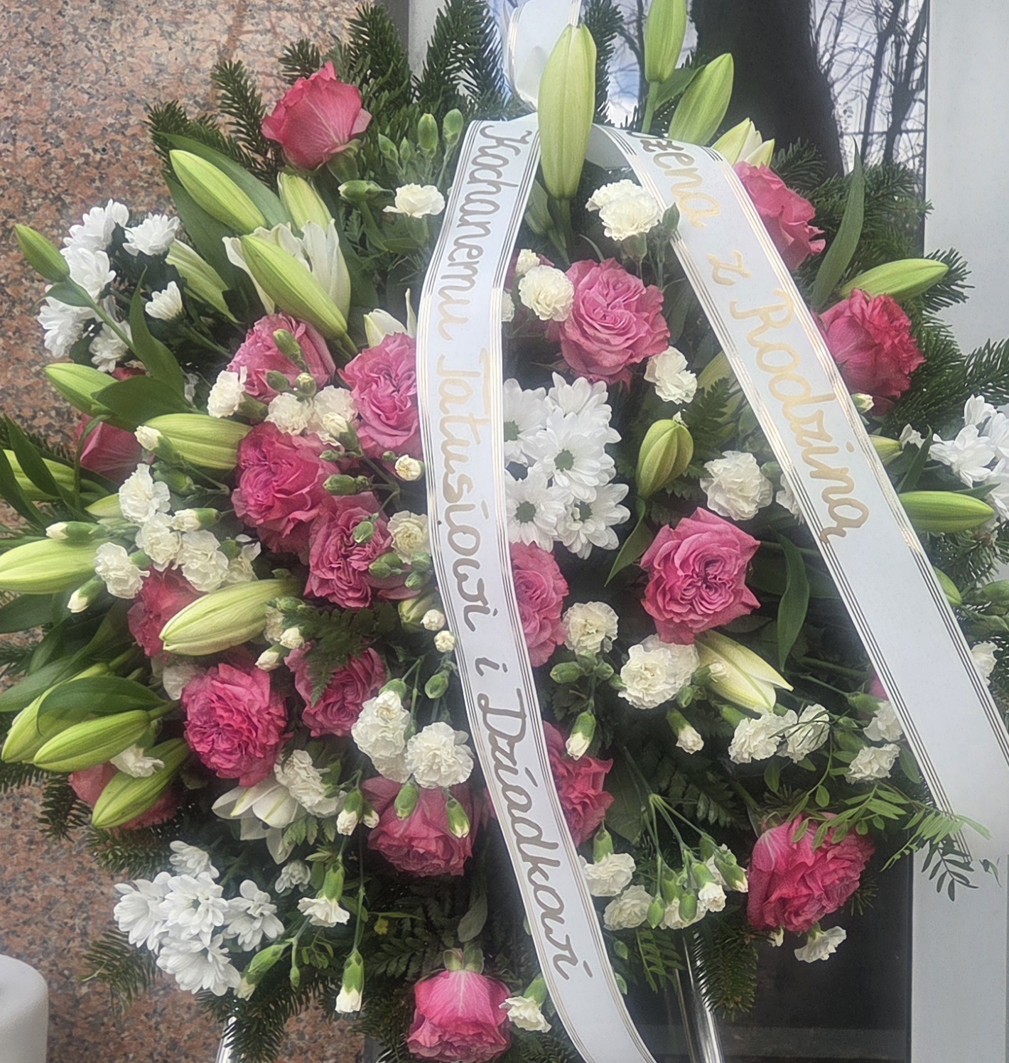 Wieniec wykonany z kwiatów Lilia, margaretka, róża, eustoma.