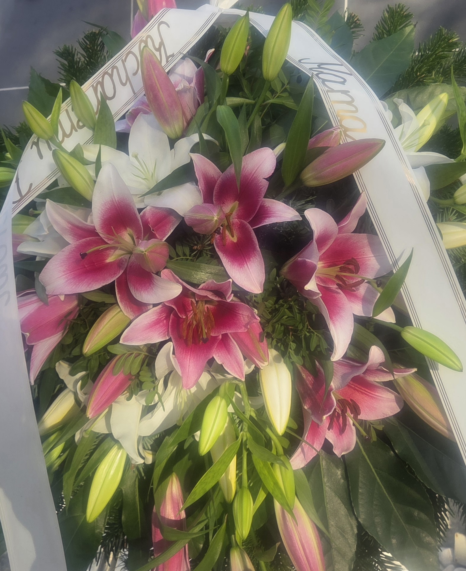 Wieniec wykonany z lilii w kolorze różowo białym.
